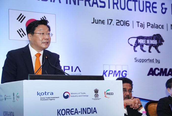 (서울=포커스뉴스) 주형환 산업통상자원부 장관이 17일(현지시간) 인도 타지팰리스호텔 샤자한홀에서 나르말라 시타라만(Nirmala Sitharaman) 인도 상공부 장관, 조 현 주인도 한국대사, 하샤바르단 니오티아(Harshavardhan Neotia) 인도 상의(FICCI) 회장을 비롯한 한-인도 양국 기업인 200여명이 참석한 가운데 열린 '한-인도 인프라 산업협력 포럼'에 참석해, 축사를 하고 있다. <사진제공=산업통상자원부>