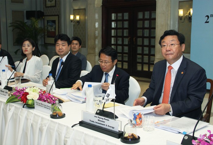 (서울=포커스뉴스) 주형환 산업통상자원부 장관이 18일(현지시간) 인도 마우라야호텔에서 나르말라 시타라만(Nirmala Sitharaman) 인도 상공부 장관(수석대표)을 비롯한 한-인도 양국 대표단이 참석한 가운데 열린'제2차 한-인도 CEPA(포괄적 경제동반자 협정) 공동위원회'에 참석해, 인사말을 하고 있다. <사진제공=산업통상자원부>