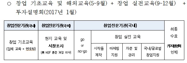 미래부는 국내 시장의 한계를 넘어 글로벌 기술창업시장 진출을 꿈꾸는 청년들을 위해 실전형 창업활동 지원을 이어갈 예정이다. 그 일환으로 미국 현지 창업활동을 완료한 후에는 맞춤형 멘토링 및 실전 사업화 코칭(비즈니스모델보완, 시제품제작, 마케팅지원 등)을 실시하고, 엑셀러레이터, 엔젤투자자 등이 참여하는 설명회를 개최하여 투자 연계에도 적극 나설 계획이다.기술창업탐색팀의 총 교육과정.<표제공=미래부>