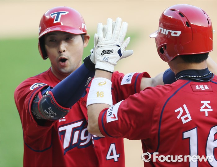 (서울=포커스뉴스) 19일 서울 잠실구장에서 열린 2016 프로야구 KIA-LG 경기 6회초 2사후 KIA 서동욱이 우중월 만루 홈런을 치고 선행주자 김주찬의 환영을 받으며 홈인하고 있다.