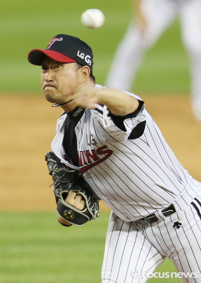 (서울=포커스뉴스) 19일 서울 잠실구장에서 열린 2016 프로야구 KIA-LG 경기에서 LG 투수 봉중근이 8회 등판해 투구하고 있다.