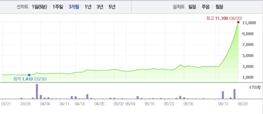 이는 10일 전 주가인 10일(2955원)과 비교했을 때 3.75배 뛴 수치다.