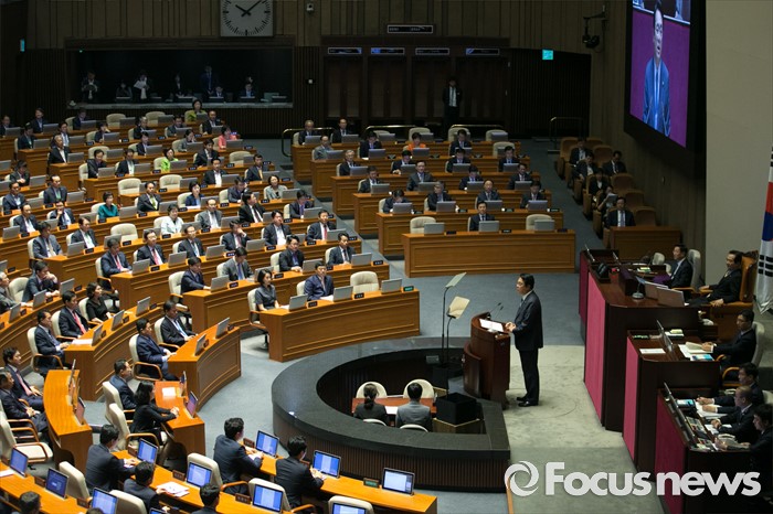 (서울=포커스뉴스) 20일 오전 서울 여의도 국회에서 열린 343회 국회(임시회) 3차 본회의에 참석한 정진석 새누리당 원내대표가 교섭단체 대표연설을 하고 있다.