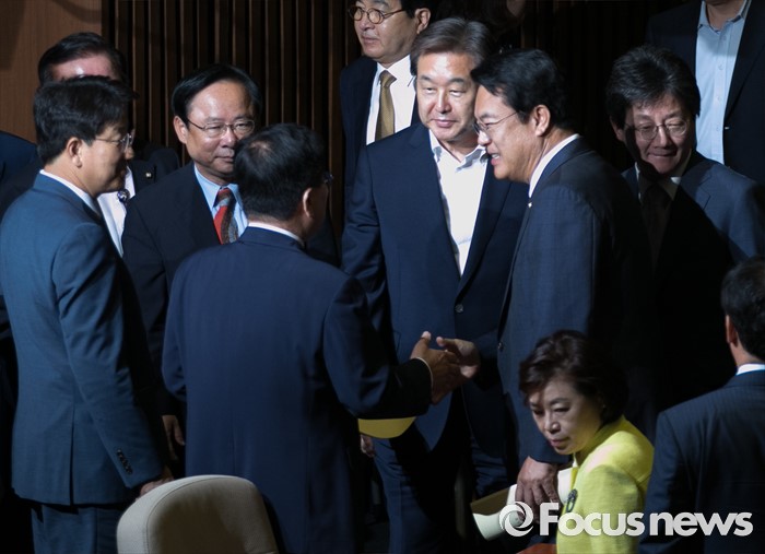 (서울=포커스뉴스) 20일 오전 서울 여의도 국회에서 열린 343회 국회(임시회) 3차 본회의에 참석한 정진석 새누리당 원내대표가 교섭단체 대표연설을 마친 뒤 김광림 정책위의장, 김무성 전 대표, 유승민 의원 등과 악수하고 있다.