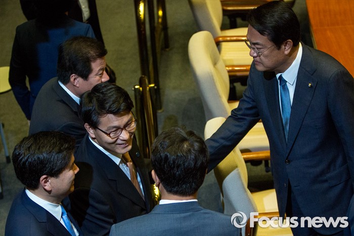 (서울=포커스뉴스) 윤상현 새누리당 의원이 20일 오전 서울 여의도 국회에서 열린 본회의에 참석해 동료 의원들과 인사 하고 있다.