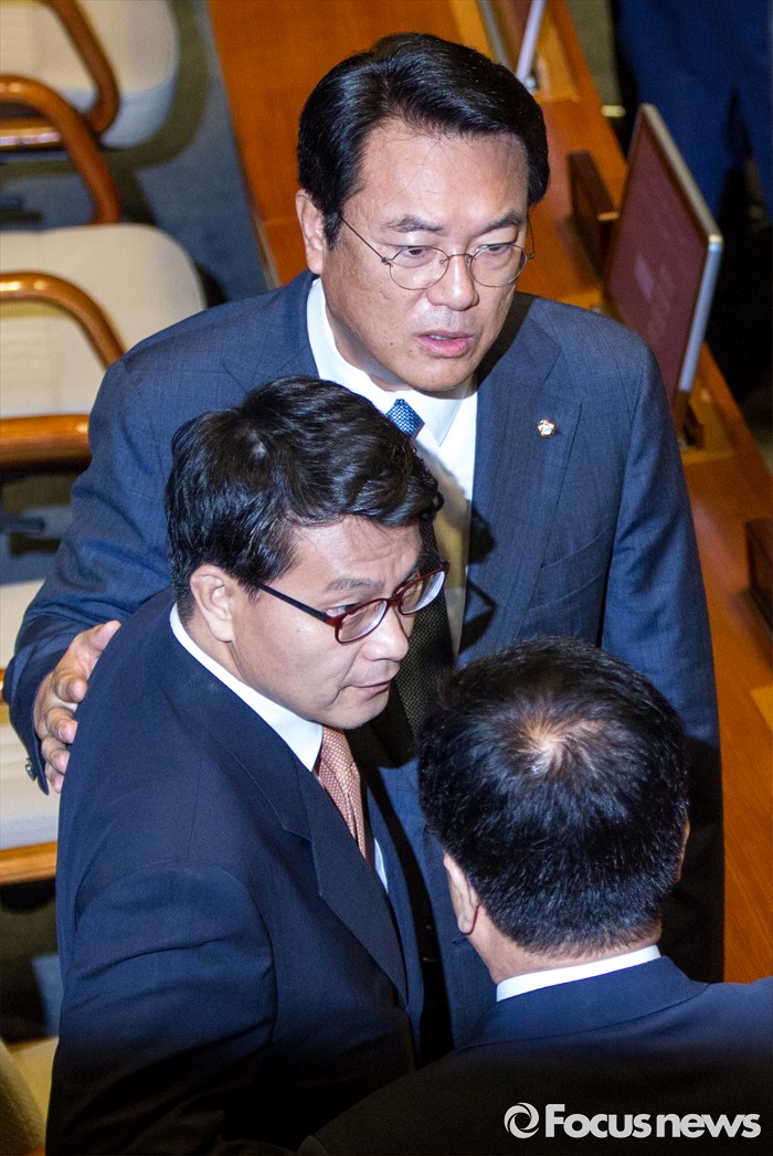 (서울=포커스뉴스) 정진석(오른쪽) 새누리당 원내대표와 윤상현(가운데) 새누리당 의원이 20일 오전 서울 여의도 국회에서 열린 본회의에 참석해 대화 하고 있다.