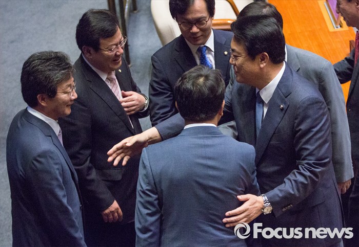 (서울=포커스뉴스) 정진석(오른쪽) 새누리당 원내대표와 권성동(오른쪽 두 번째) 새누리당 사무총장이 20일 오전 서울 여의도 국회에서 열린 본회의에 참석해 인사 하고 있다. 사진 왼쪽은 유승민 새누리당 의원.
