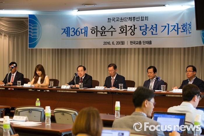 (서울=포커스뉴스) 20일 오전 서울 서초구 한국교원단체총연합회에서 열린 제36대 한국교총 회장선거에 선출된 하윤수 부산교대 총장이 인사말을 하고 있다.