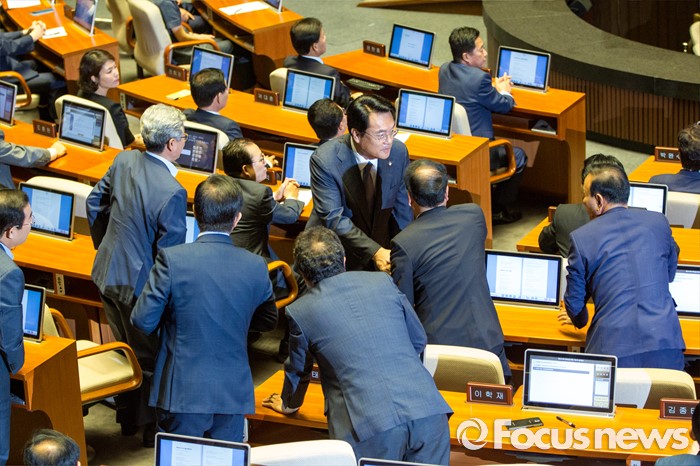 (서울=포커스뉴스) 정진석 새누리당 원내대표가 20일 오전 서울 여의도 국회에서 열린 본회의에 참석해 교섭단체 대표 연설을 마친 뒤 동료 의원들과 인사하고 있다.