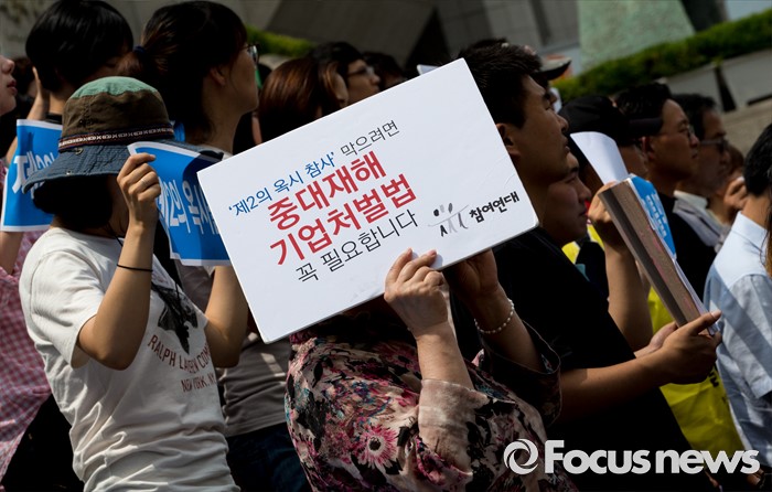 (서울=포커스뉴스) 20일 오후 서울 종로구 세종문화회관 앞 계단에서 환경운동연합과 시민사회단체들이 가습기 살균제 참사 전국네트워크 출범 기자회견을 하고 있다.