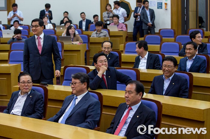 (서울=포커스뉴스) 조원진(오른쪽 두 번째) 새누리당 의원을 비롯한 친박계 초재선 의원들이 20일 오후 서울 여의도 국회의원회관에 모여 간담회 시작을 기다리고 있다.