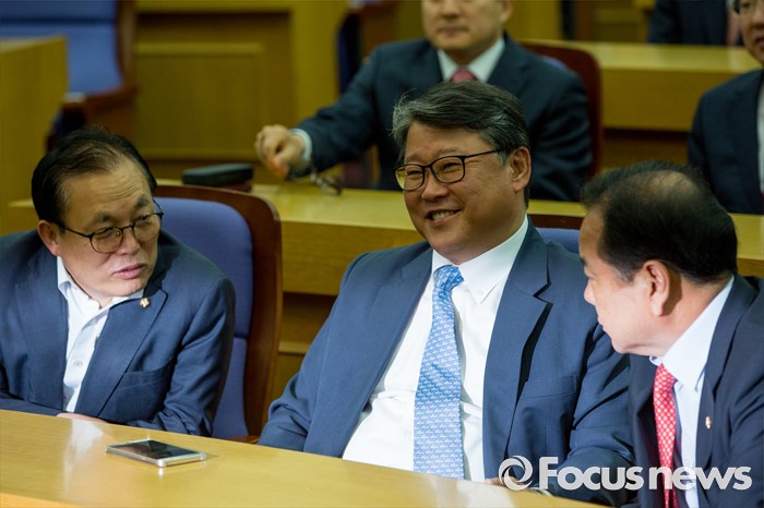 (서울=포커스뉴스) 조원진(가운데) 새누리당 의원 및 이우현(왼쪽) 의원, 이채익 의원이 20일 오후 서울 여의도 국회의원회관에서 열린 친박계 초재선 의원 모임에 참석해 대화를 나누고 있다.