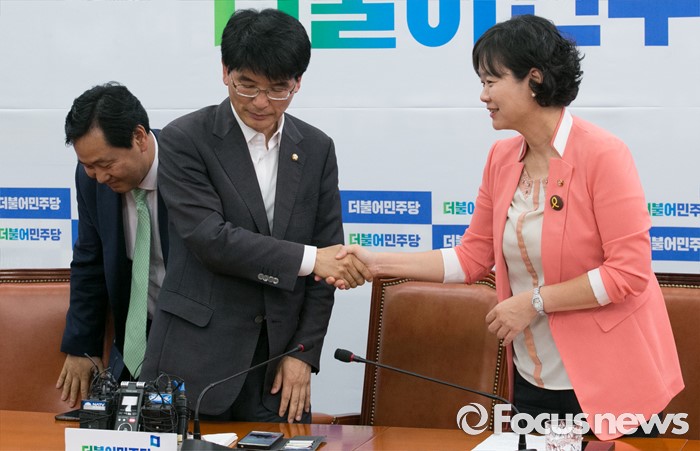 (서울=포커스뉴스) 박완주(가운데) 더불어민주당 원내수석부대표, 김관영(왼쪽) 국민의당 원내수석부대표, 이정미 정의당 원내수석부대표가 20일 오후 서울 여의도 국회에서 현안 관련 야3당 원내수석부대표 회동에 앞서 인사하고 있다.