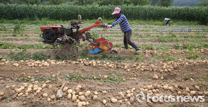 (괴산-포커스뉴스) 장마철을 앞두고 20일 오후 충북 괴산군 들녘에서 농민들이 감자를 수확하고 있다.