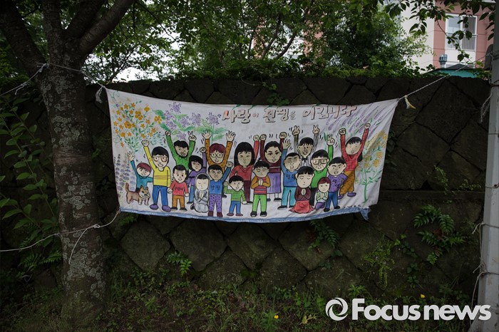 (제주=포커스뉴스) 서귀포시가 제주해군기지 크루즈터미널 조성공사를 이유로 해군기지 건설 반대운동에 사용해 온 망루 등 시설물들을 자진 철거하라는 3차 계고장을 강정마을회에 보내 행정대집행이 예고되고 있다. 20일 오전 제주 서귀포시 강정마을에 '사랑이 전쟁을 이깁니다'라는 플래카드가 걸려 있다. 이날 행정대집행 문제로 회의를 한 강정마을회는 "이들 시설물은 기지 건설 반대 투쟁에 대한 상징적인 것으로 함부로 철거할 수 없다고 마을 주민의 의견을 모았다"며 시설물을 이전한 뒤 보존해달라'고 제주도에 건의했다.