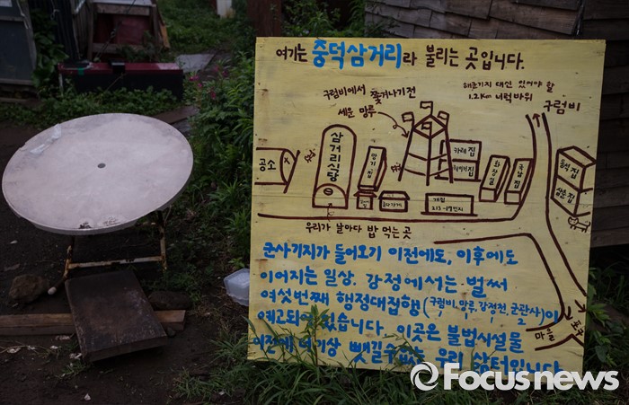 (제주=포커스뉴스) 서귀포시가 제주해군기지 크루즈터미널 조성공사를 이유로 해군기지 건설 반대운동에 사용해 온 망루 등 시설물들을 자진 철거하라는 3차 계고장을 강정마을회에 보내 행정대집행이 예고되고 있다. 20일 오전 제주 서귀포시 강정마을 중덕삼거리에 활동가가 그려놓은 메시지가 놓여져 있다. 이날 행정대집행 문제로 회의를 한 강정마을회는 "이들 시설물은 기지 건설 반대 투쟁에 대한 상징적인 것으로 함부로 철거할 수 없다고 마을 주민의 의견을 모았다"며 시설물을 이전한 뒤 보존해달라'고 제주도에 건의했다.
