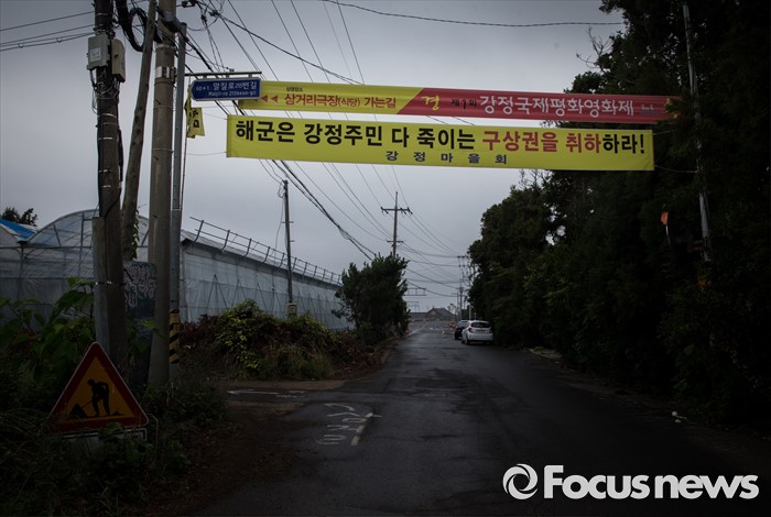 (제주=포커스뉴스) 서귀포시가 제주해군기지 크루즈터미널 조성공사를 이유로 해군기지 건설 반대운동에 사용해 온 망루 등 시설물들을 자진 철거하라는 3차 계고장을 강정마을회에 보내 행정대집행이 예고되고 있다. 20일 오전 제주 서귀포시 강정마을에 구상권 철회를 요구하는 플래카드가 붙어 있다.