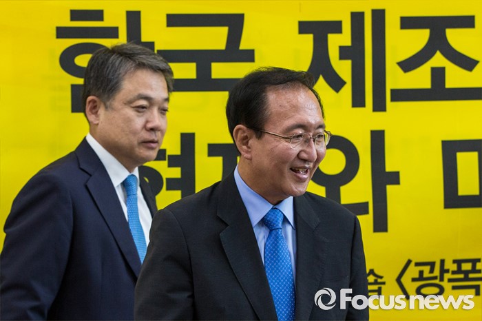 (서울=포커스뉴스) 노회찬(오른쪽) 정의당 원내대표와 정진행 현대자동차 사장이 21일 오전 서울 여의도 국회에서 열린 '정의당 광폭경청'에 참석해 인사한 뒤 자리로 이동 하고 있다.