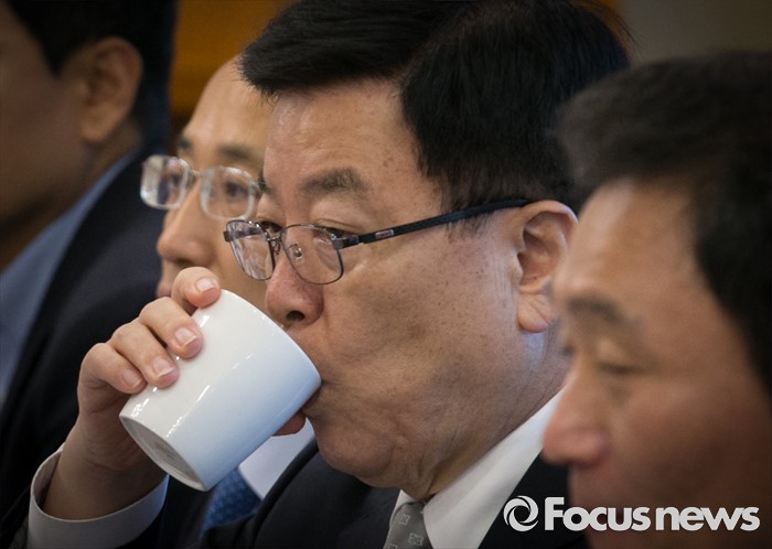 (서울=포커스뉴스) 21일 오전 서울 여의도 국회 귀빈식당에서 열린 새누리당 일자리특위 1차 회의에 참석한 김광림 정책위의장이 물을 마시고 있다.
