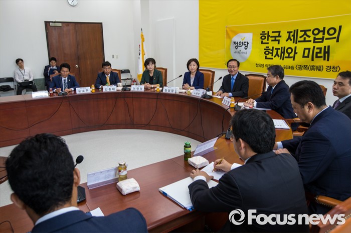 (서울=포커스뉴스) 노회찬(오른쪽) 정의당 원내대표와 정진행 현대자동차 사장이 21일 오전 서울 여의도 국회에서 열린 '정의당 광폭경청'에 참석해 인사한 뒤 자리로 이동 하고 있다.