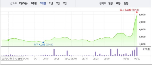 우원개발은 21일 오전 9시14분 현재 전일 대비 14.39%(1000원) 상승한 7950원에 거래되고 있다. 우원개발은 17일과 20일에도 7.75, 29.91%의 상승폭을 기록하며 뚜렷한 상승곡선을 그리고 있다.