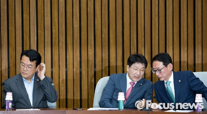 (서울=포커스뉴스) 권성동 새누리당 사무총장과 김도읍 원내수석부대표가 21일 오전 서울 여의도 국회에서 열린 원내대책회의에 참석해 대화를 나누고 있다. 사진 왼쪽은 정진석 새누리당 원내대표