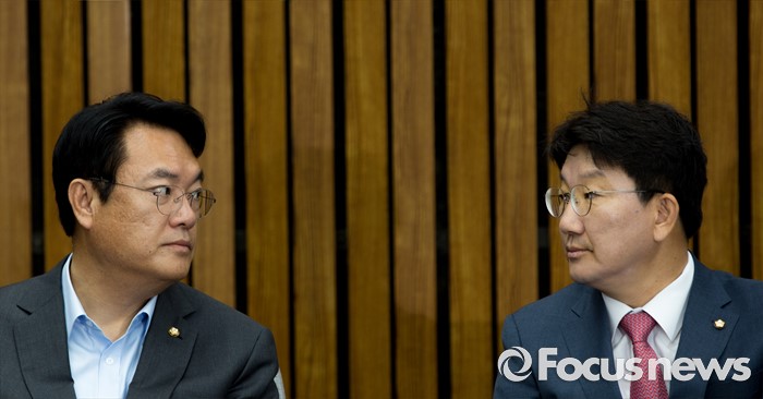 | △ 대화하는 정진석 원내대표-권성동 사무총장 |