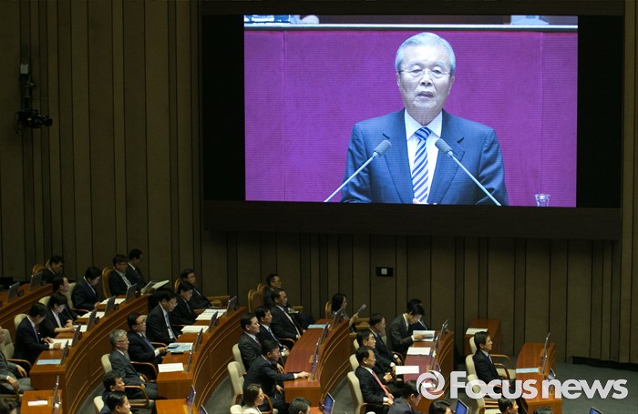 (서울=포커스뉴스) 21일 오전 서울 여의도 국회에서 열린 343회 국회(임시회) 4차 본회의에 참석한 김종인 더불어민주당 비대위 대표가 교섭단체 대표연설을 하고 있다.