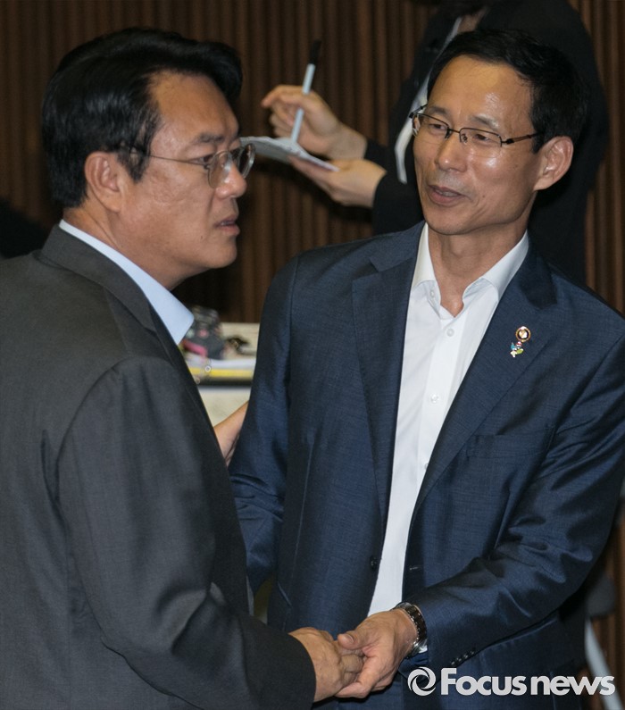 (서울=포커스뉴스) 21일 오전 서울 여의도 국회에서 열린 343회 국회(임시회) 4차 본회의에 참석한 정진석(왼쪽) 새누리당 원내대표와 최정호 국토교통부 2차관이 대화하고 있다.
