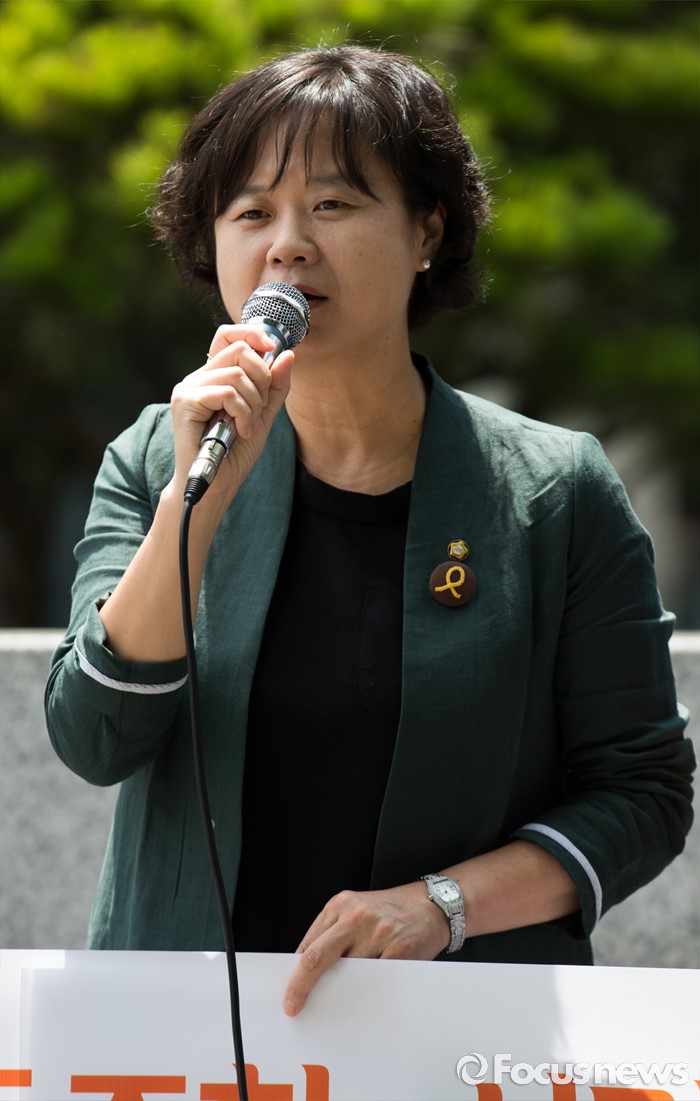 (서울=포커스뉴스) 21일 오전 서울 영등포구 산업은행 본점 앞에서 열린 조선해운업 구조조정 관련 정부와 금융당국, 산업은행 규탄 기자회견에서 이정미 정의당 원내수석부대표가 모두발언 하고 있다.