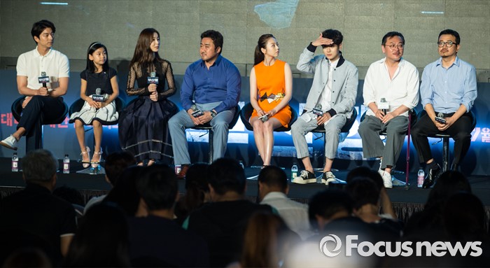 (서울=포커스뉴스) 21일 오전 서울 종로구 나인트리컨벤션에서 열린 영화 '부산행' 제작보고회에 참석한 출연진이 취재진에게 질문을 받고 있다. 왼쪽부터 배우 공유, 김수안, 정유미, 마동석, 안소희, 최우식, 김의성, 연상호 감독.