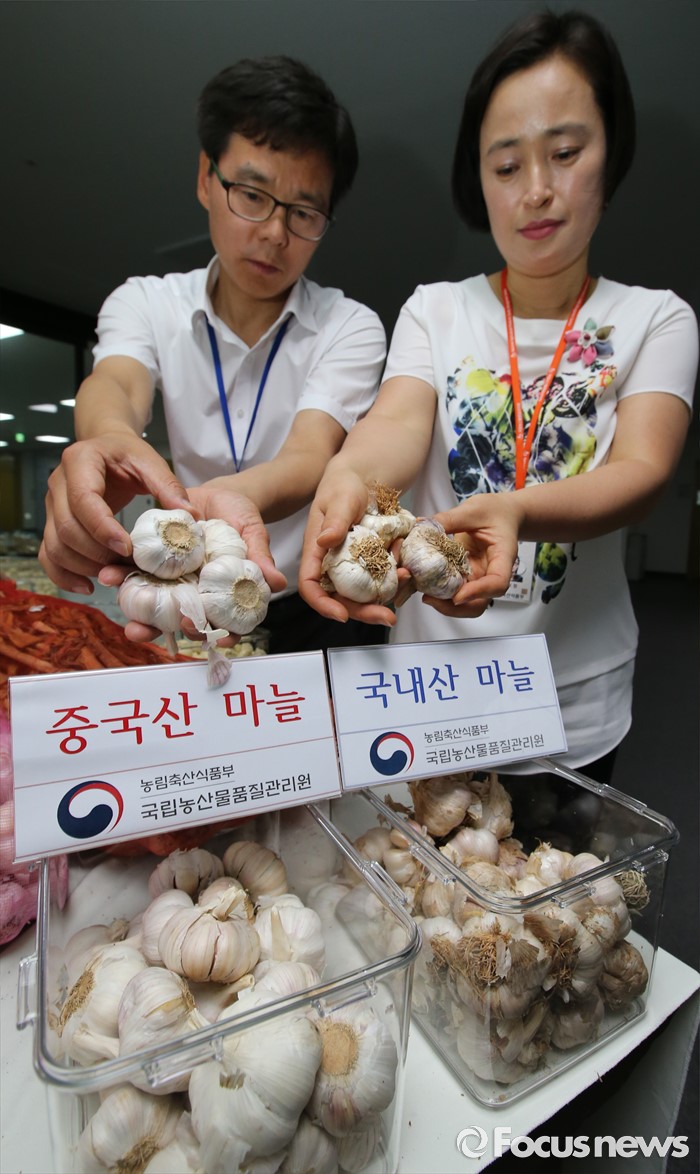 (세종=포커스뉴스) 국립농산물품질관리원 직원들이 21일 오전 세종시정부세종청사 농림축산식품부 기자실에서 국내산 마늘과 중국산 마늘을 비교하고 있다. 중국산 마늘은 잔뿌리가 제거돼 깨끗한 상태다.