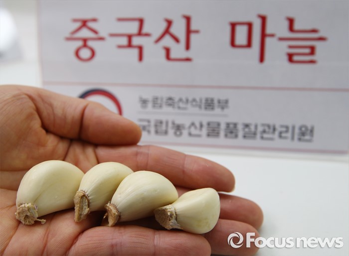 (세종=포커스뉴스) 국립농산물품질관리원 직원들이 21일 오전 세종시정부세종청사 농림축산식품부 기자실에서 국내산 마늘과 중국산 마늘을 비교하고 있다. 중국산 마늘은 잔뿌리가 제거돼 깨끗한 상태다.