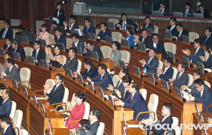 (서울=포커스뉴스) 21일 오전 서울 여의도 국회에서 열린 343회 국회(임시회) 4차 본회의에 참석한 더불어민주당 의원들이 김종인 비대위 대표의 교섭단체 대표연설 중 박수를 치고 있다.