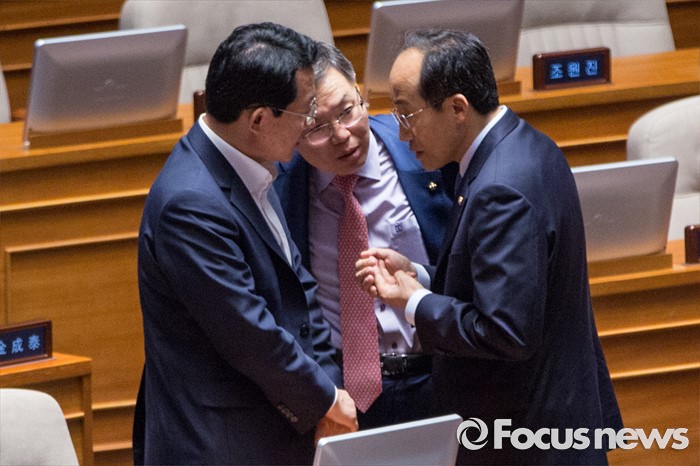 (서울=포커스뉴스) 추경호(오른쪽) 새누리당 의원이 21일 오전 서울 여의도 국회에서 열린 본회의에 참석해 동료 의원들과 대화 하고 있다.