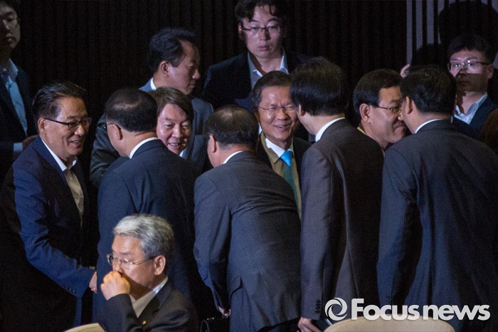 (서울=포커스뉴스) 안철수 국민의당 상임공동대표를 비롯한 지도부들이 21일 오전 서울 여의도 국회에서 열린 본회의에 참석해 국회사무총장 임명승인안 투표를 기다리며 국무위원들과 악수 하고 있다.