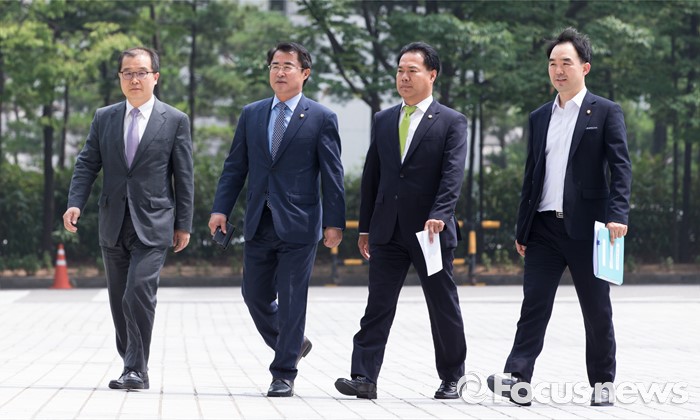 (서울=포커스뉴스) 21일 오후 서울 서초구 대검찰청에서 이용주(오른쪽 두번째) 국민의당 의원이 어버이연합 등 불법자금지원 의혹 규명 진상조사 특별팀(TF)의 항의방문을 위해 대검으로 들어서고 있다. 왼쪽부터 이건태 국민의당, 최경환 의원, 이용주 의원, 채이배 의원.