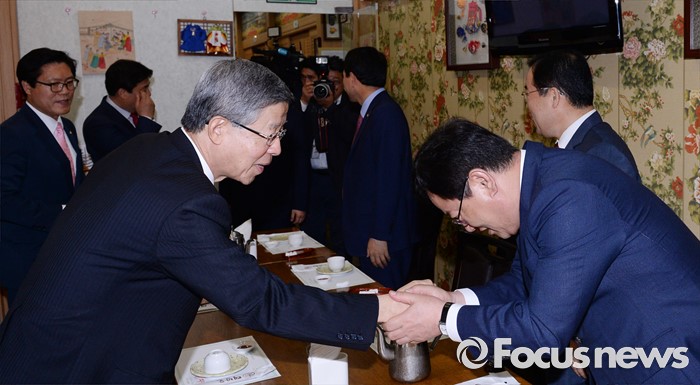 (서울=포커스뉴스) 김희옥 새누리당 혁신비대위원장이 21일 오후 서울 여의도 한 식당에서 초선 의원들과의 오찬에 앞서 인사하고 있다.