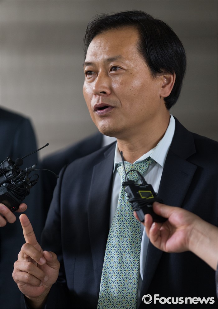 (서울=포커스뉴스) 채희준(오른쪽) 민주 사회를 위한 변호사모임 통일위원회 위원장이 21일 오후 서울 서초구 서울중앙지방법원에서 국가정보원 상대 북한 식당종업원 인신구제청구 1차 심문기일에 참석 전 취재진 질문에 답변하고 있다.