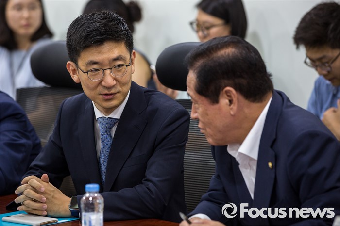 (서울=포커스뉴스) 동남권 신공항 입지발표를 앞두고 발표 중계방송 시청을 위해 모인 유재중 새누리당 의원과 조경태 의원이 21일 오후 서울 여의도 국회의원회관에서 대화를 나누고 있다.