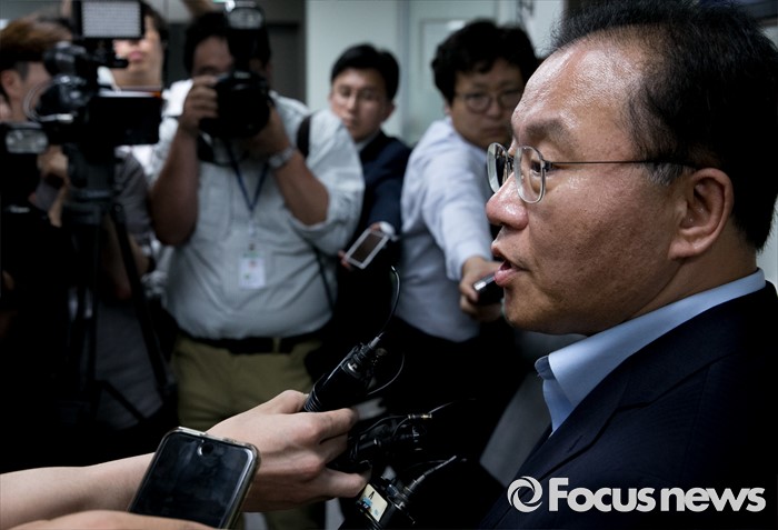 (서울=포커스뉴스) 윤재옥 새누리당 의원이 21일 오후 서울 여의도 국회 의원회관 사무실에서 대구 지역 의원들과 모임을 갖고 영남권 신공항 결과 발표를 지켜본 뒤 취재진 질문에 답하고 있다.