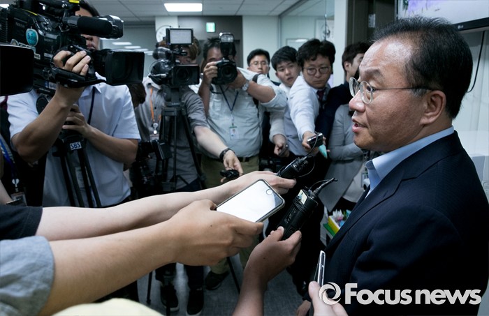 (서울=포커스뉴스) 윤재옥 새누리당 의원이 21일 오후 서울 여의도 국회 의원회관 사무실에서 대구 지역 의원들과 모임을 갖고 영남권 신공항 결과 발표를 지켜본 뒤 취재진 질문에 답하고 있다.