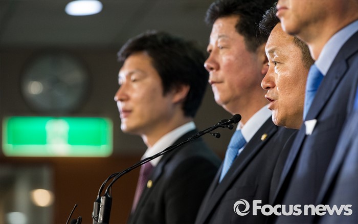 (서울=포커스뉴스) 21일 오후 서울 여의도 국회 정론관에서 최인호 더불어민주당 의원이 영남권 신공항 결과 발표 관련 기자회견을 하고 있다. 왼쪽부터 김해영, 박재호, 최인호, 김영춘 의원.