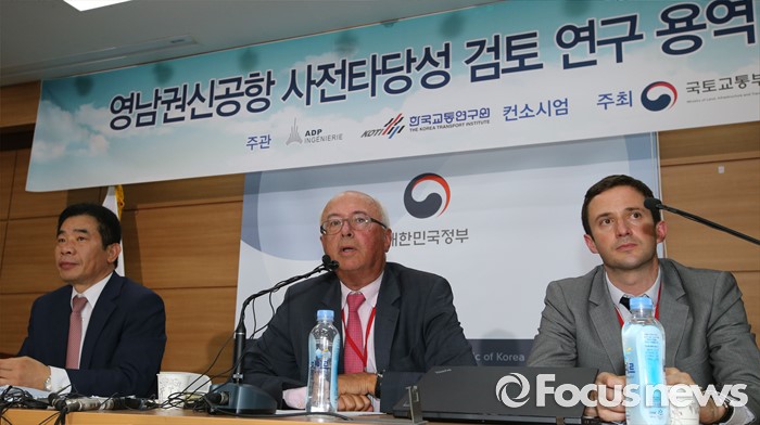 (세종=포커스뉴스) 장 마리 슈발리에 프랑스 파리공항공단자회사 ADPi 수석엔지니어가 21일 오후 세종시 정부세종청사 국토교통부 브리핑실에서 열린 동남권 신공항 타당성 검토 연구 최종 보고회에서 입지선정 결과 발표를 마치고 취재진의 질문에 답변하고 있다. 왼쪽은 서훈택 국토부 항공정책실장.