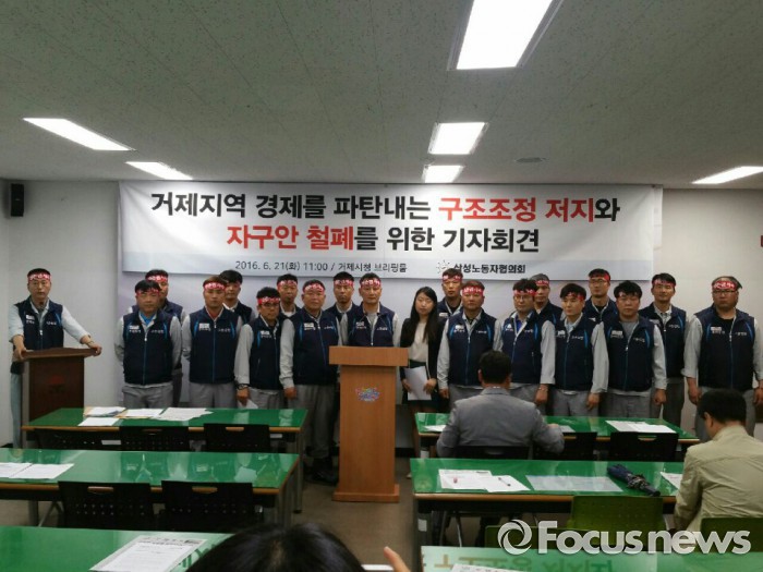 (거제=포커스뉴스) 사측의 일방적인 구조조정에 반발하고 있는 삼성중공업 노동자협의회가 강경 투쟁을 예고했다. 정부, 금융위, 채권단은 물론 삼성그룹에게도 책임을 묻겠다는 입장을 밝혔다.