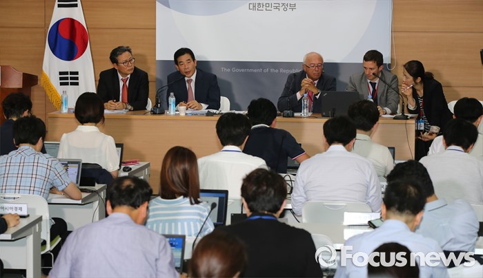 (세종=포커스뉴스) 서훈택(왼쪽 두 번째) 국토부 항공정책실장이 21일 오후 세종시 정부세종청사 국토교통부 브리핑실에서 열린 동남권 신공항 타당성 검토 연구 최종 보고회에서 입지선정 결과 발표를 마치고 취재진의 질문에 답변하고 있다.