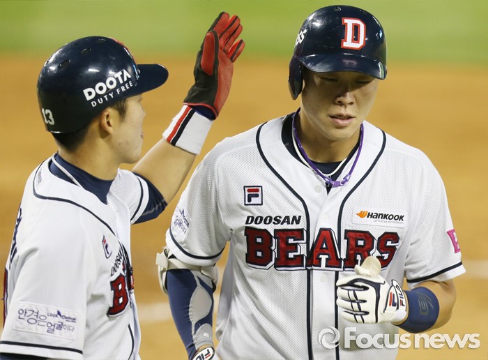 (서울=포커스뉴스) 12일 서울 잠실구장에서 열린 2016 프로야구 kt-두산 경기 4회말 2사 1루에서 두산 박세혁이 우월 2점 홈런을 치고 선행주자 허경민의 환영을 받으며 홈인하고 있다.