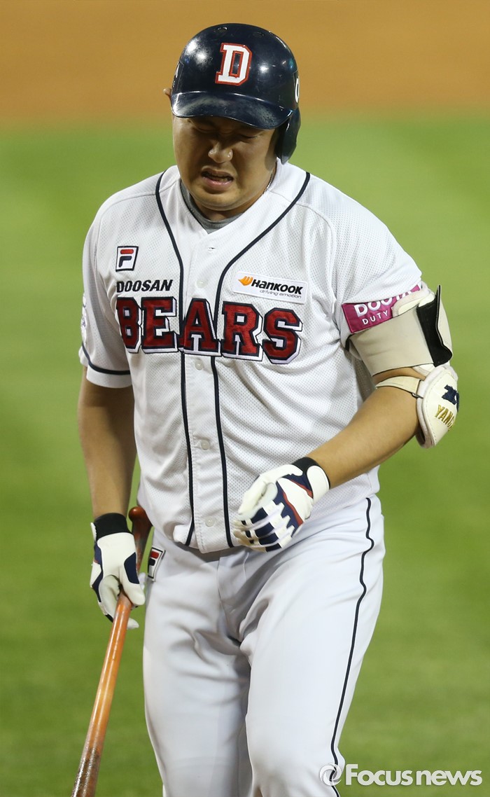 (서울=포커스뉴스) 12일 서울 잠실구장에서 열린 2016 프로야구 kt-두산 경기 8회말 무사 2루에서 대타로 나온 두산 양의지가 왼쪽 다리를 투구에 맞고 고통스러워하고 있다.