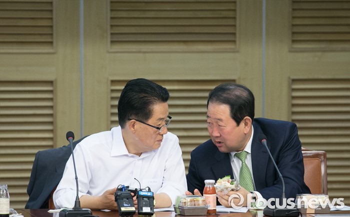 (서울=포커스뉴스) 22일 오전 서울 여의도 국회 의원회관에서 열린 국민의당 18차 정책역량강화 워크숍에 참석한 박주선(오른쪽) 국회 부의장과 박지원 원내대표가 대화하고 있다.