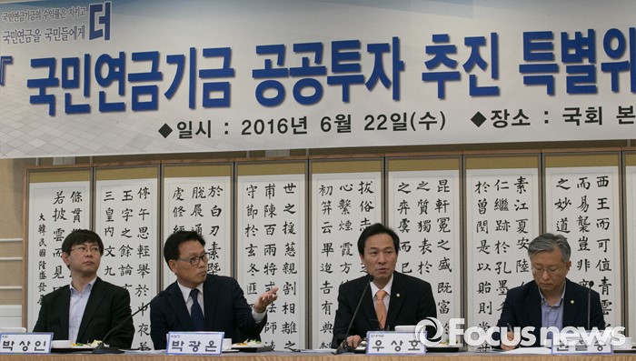 (서울=포커스뉴스) 22일 오전 서울 여의도 국회 귀빈식당에서 열린 더불어민주당 국민연금기금 공공투자 추진 특위 2차 회의에 참석한 우상호(오른쪽 두번째) 원내대표가 인사말을 하고 있다.
